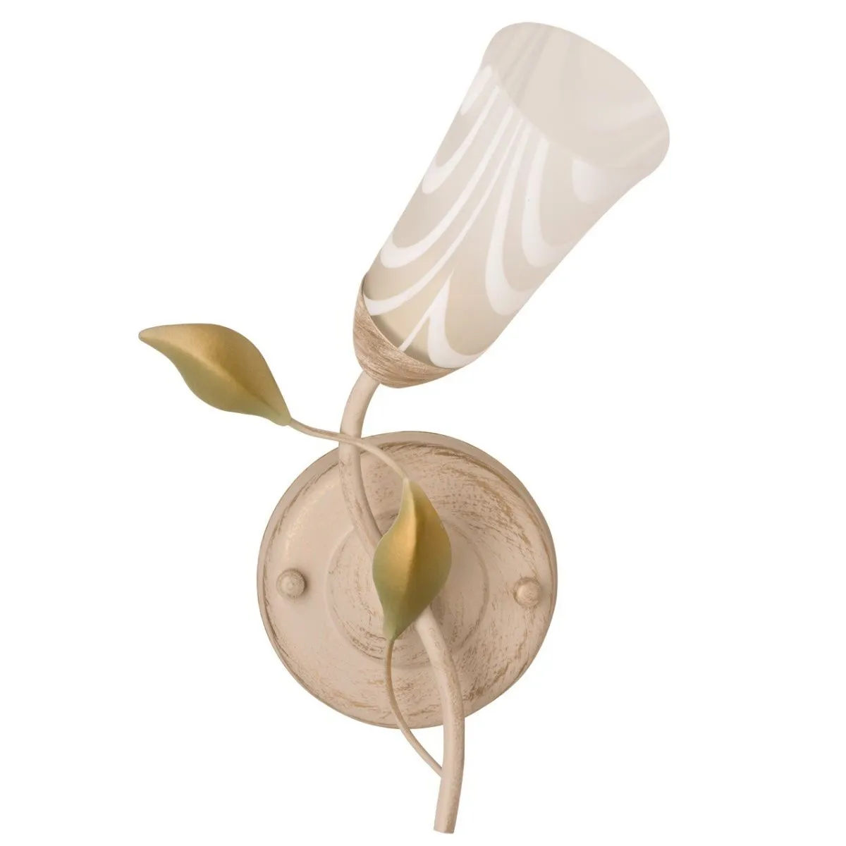 Металлическое основание белого цвета с патиной в цвет золота. Плафон: матовое стекло. Декор: металл